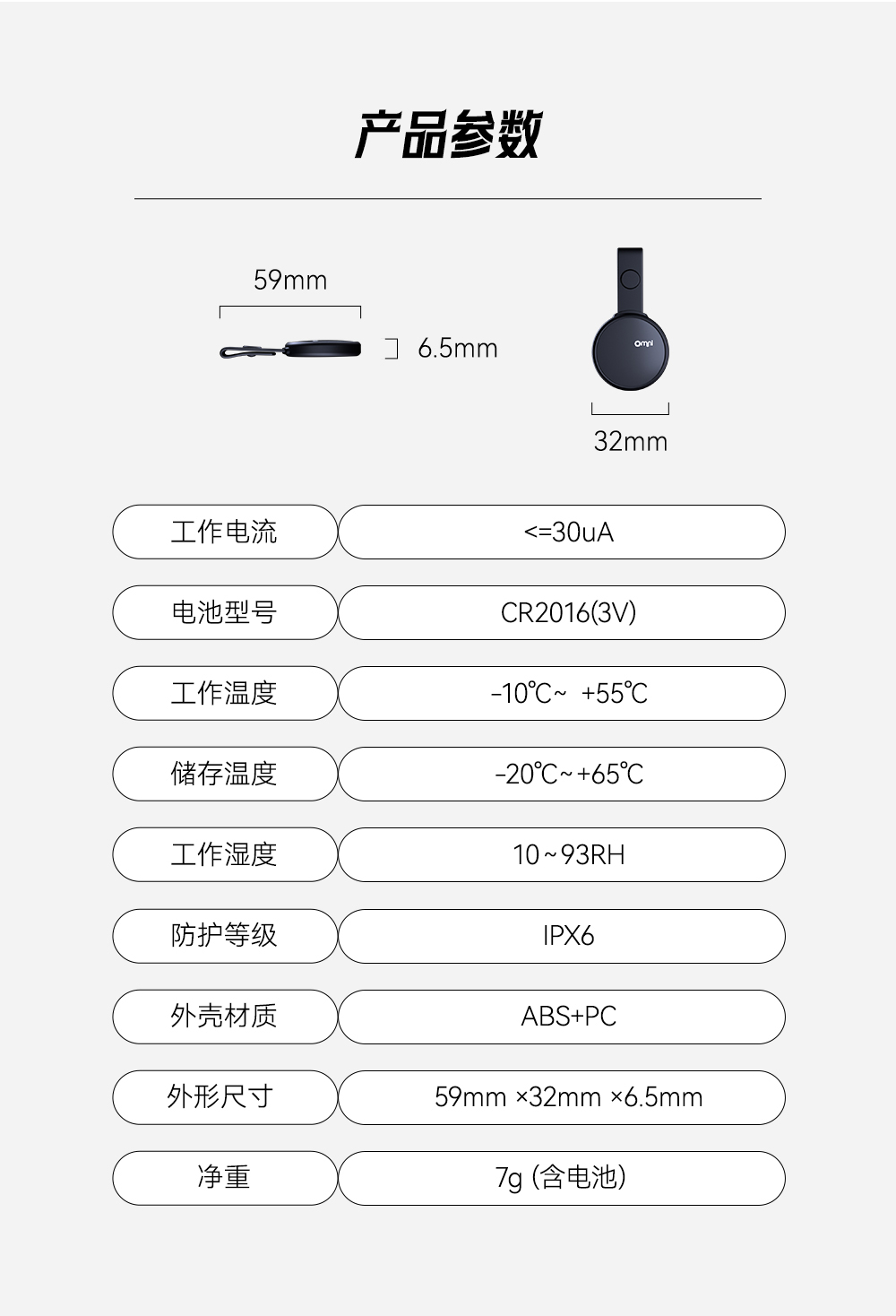 外形尺寸              長寬高:59mm ×32mm ×6.5mm(含硅膠帶)